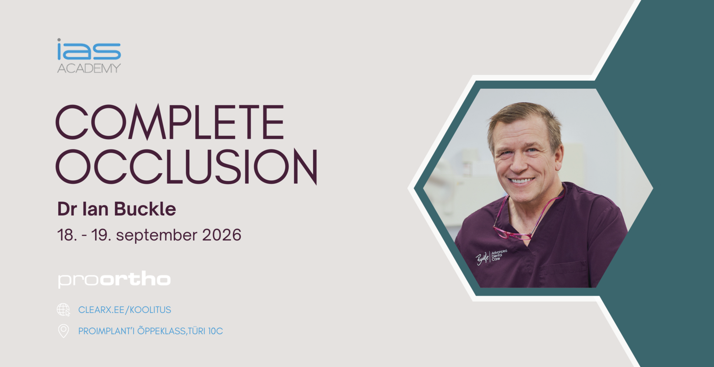 Koolitust viib läbi tunnustatud inglise proteesiarst dr Ian Buckle, kellel on hambaravikogemust üle 30 aasta, olles edukas kliinikuomanik Liverpoolis ning koolitades regulaarselt arste üle kogu maailma.